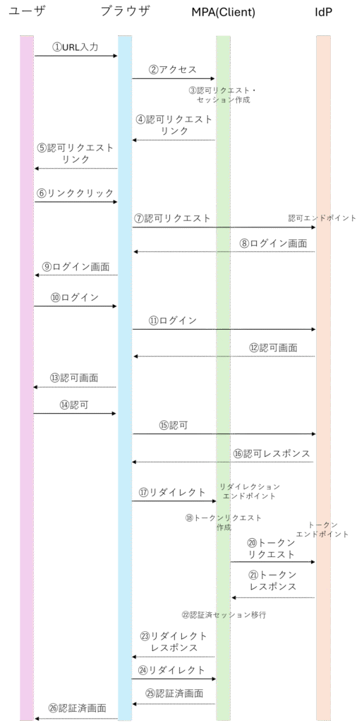 ①ブラウザからIdPの認可エンドポイントへアクセスしてスタート