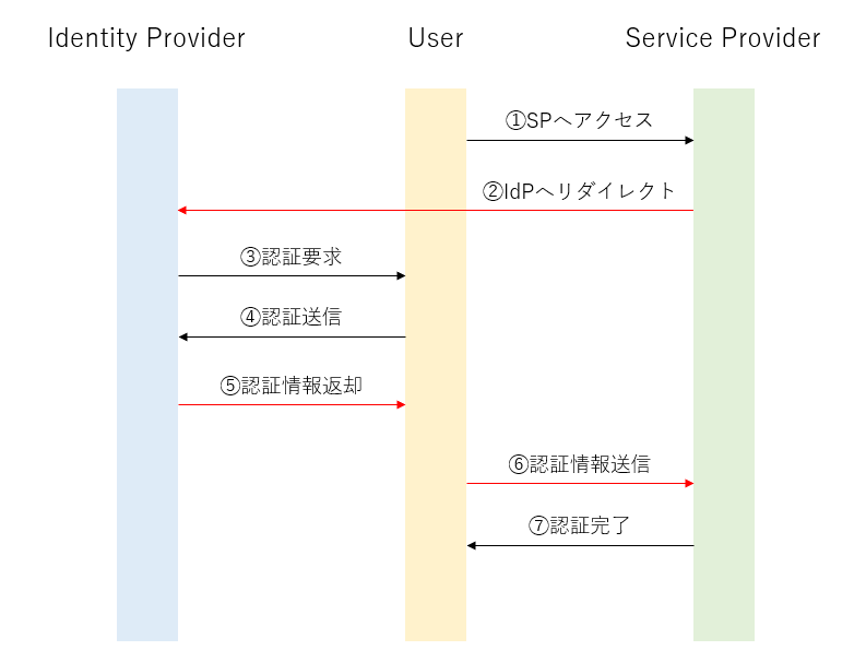 赤矢印の②がSAMLのRequestで、⑤,⑥がSAMLのResponseになる。